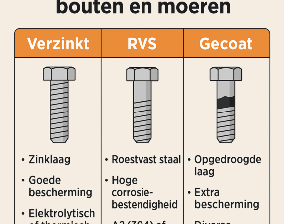 In deze blog bespreken we de meest gebruikte methoden om bouten en moeren te beschermen tegen corrosie: verzinken, roestvast staal (RVS) en speciale coatings.
